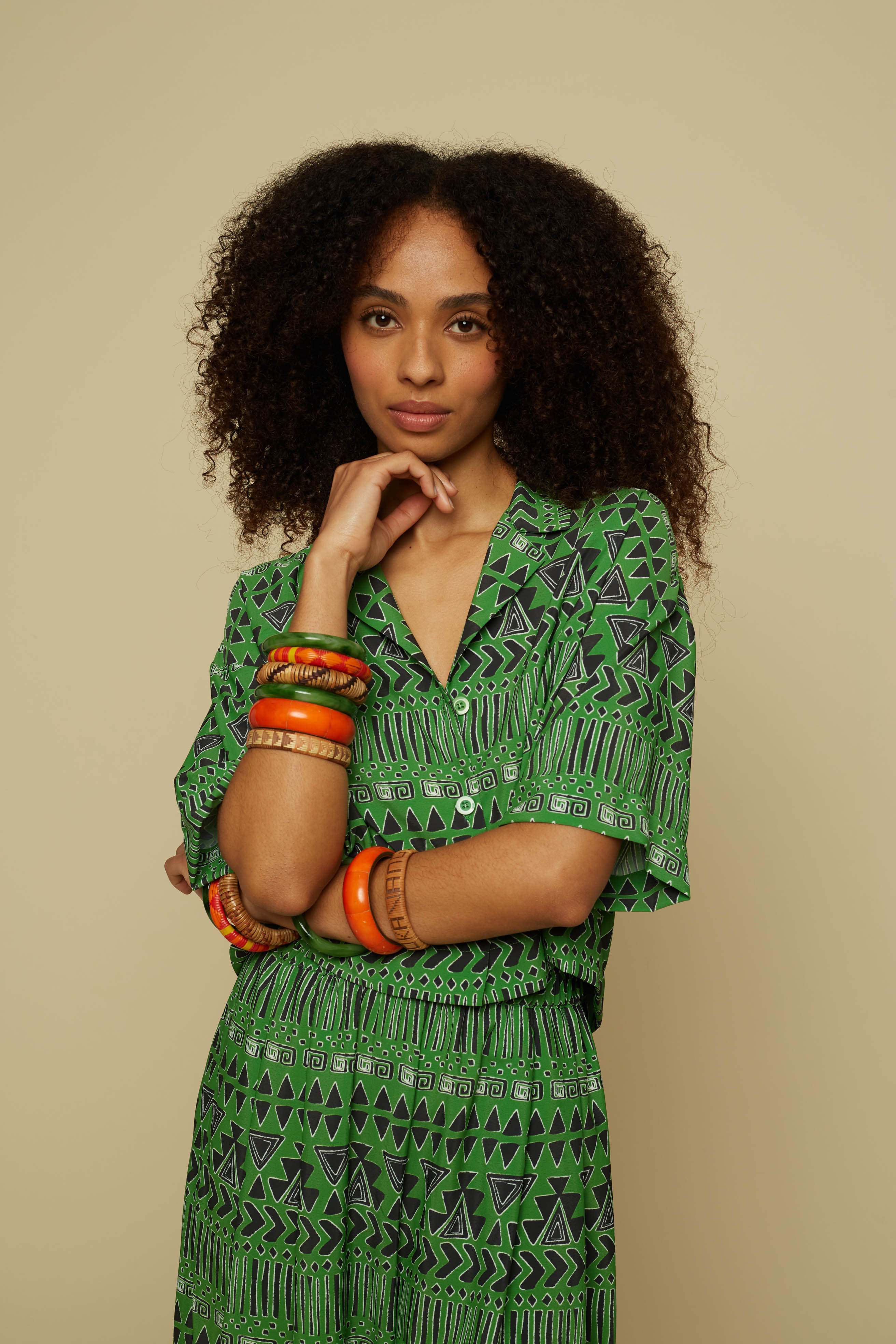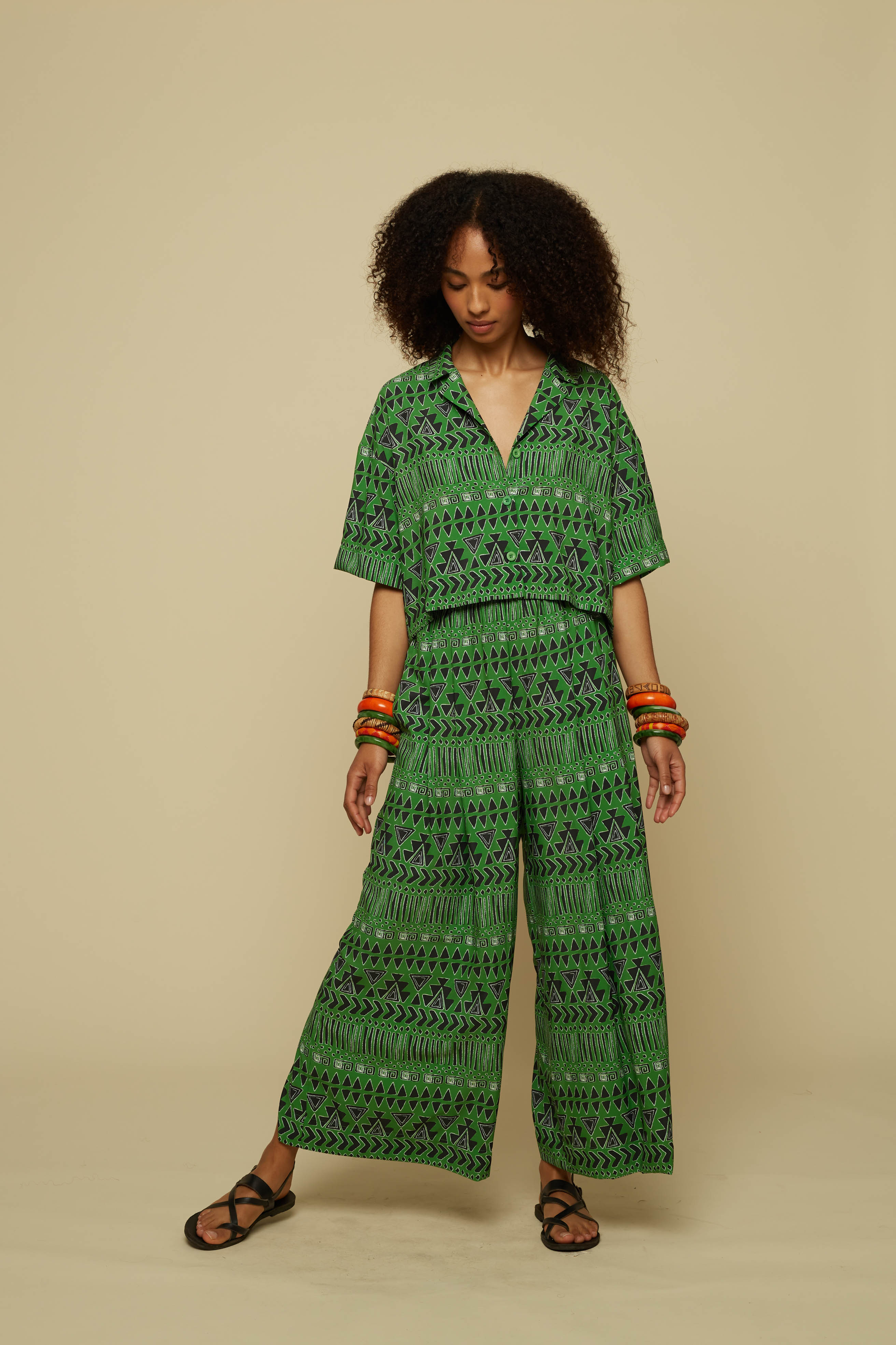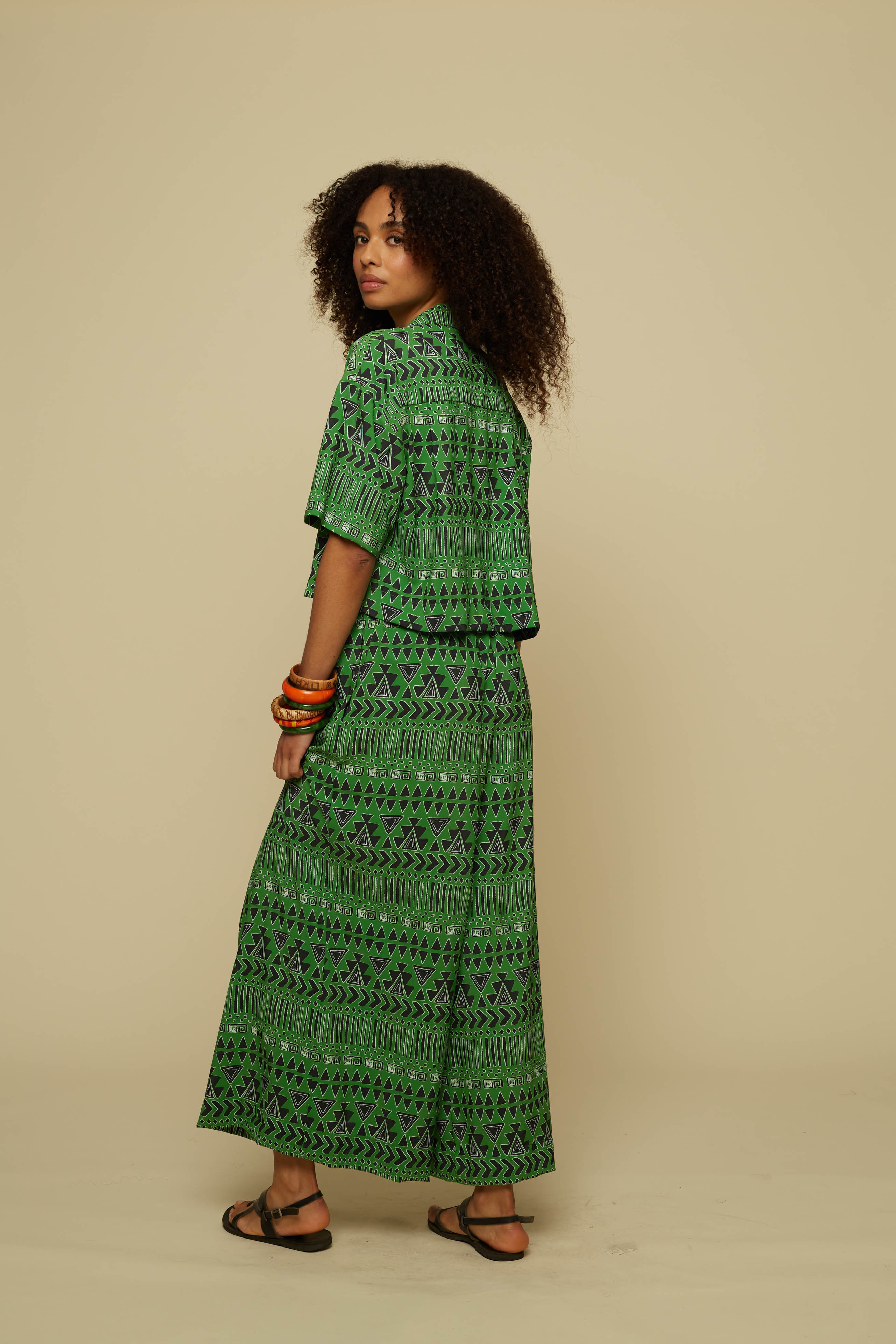 SCHEMA CROP SHIRT (GREEN ABSTRACT GEOMETRY PRINT)